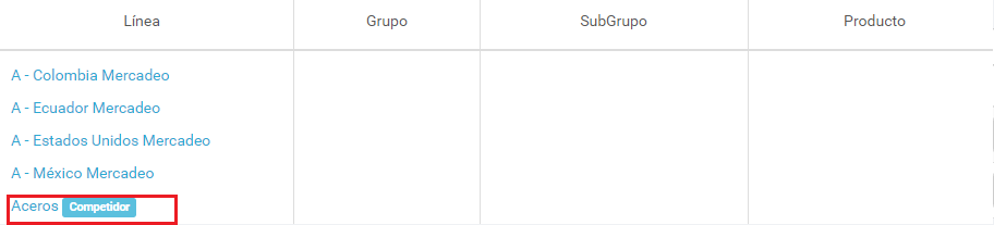 En la jerarquía de productos es posible adicionar líneas que correspondan a competidores. Las líneas marcadas como competidor no se visualizaran en el catálogo al momento de presentarlo a un cliente, pero los productos de estás líneas podrán ser incluidos para tomar información de mercado.