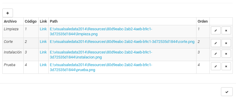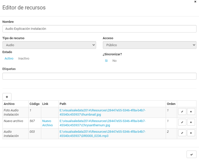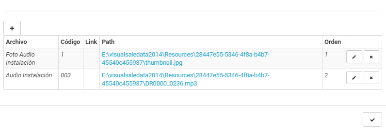 En esta pantalla se visualizan varios registros. El primero corresponde a la imagen de pre visualización. Para que esta imagen se pueda visualizar en el dispositivo móvil se debe crear el archivo con el nombre thumbnail. Si no se define con este nombre no se verá la imagen. El segundo registro corresponde a un archivo de Audio con extensión mp3, el cual fue cargado al Back de Visual Sale y luego mediante la sincronización pasará al dispositivo móvil.