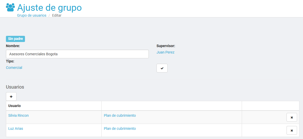 - Crear la relación Supervisor Vs Vendedor, en la opción Grupo de Usuarios > Grupo de Usuarios. En el ejemplo se tiene a Juan Pérez como supervisor y Luz Arias como vendedor.
