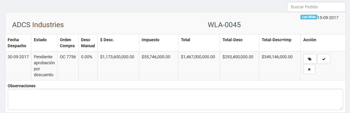 Pantalla Pedido en estado "Pendiente Aprobación por Descuento"