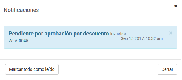 en la parte superior derecha de la pantalla de VisualSale. En el ejemplo vemos que se muestra una notificación llamada "Pendiente por aprobación por descuento", luz.arias quien fue el asesor que creo el pedido, con el número de pedido WLA-0045 y la fecha y hora. La notificación es marcada por el Supervisor como leída dando clic en la X o dando clic en el recuadro "Marcar todo como leído", una vez marcada esta notificación no se muestra más en la pantalla.